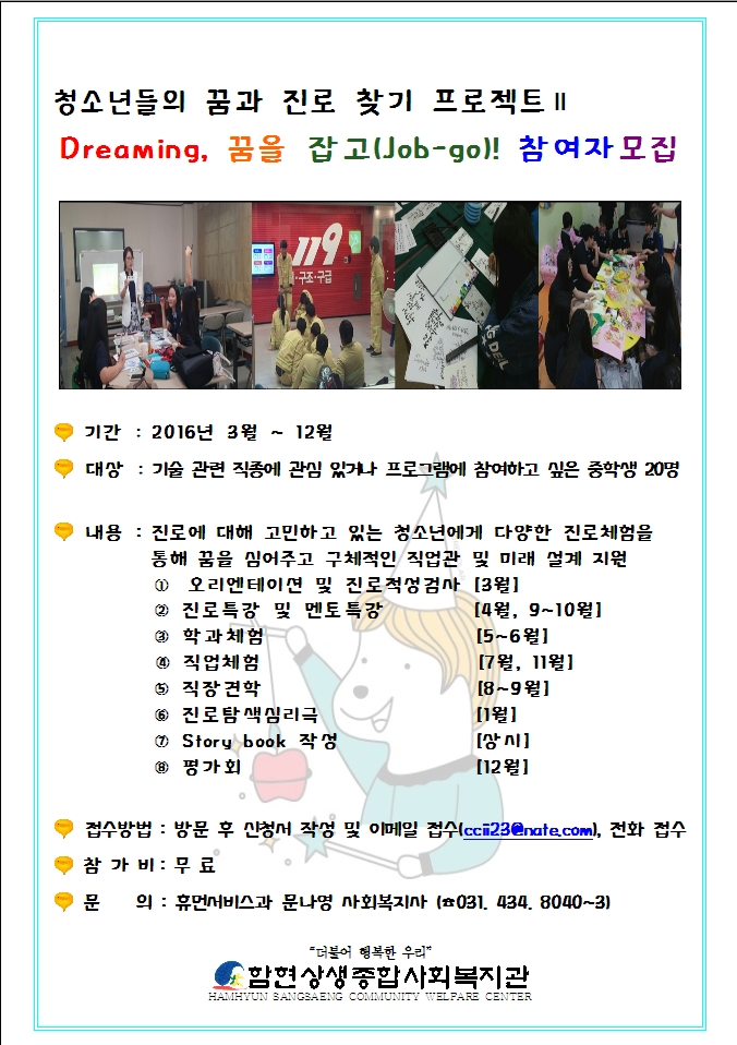 [종료]/[함현상생종합사회복지관] 청소년들의 꿈과 진로 찾기 프로젝트 참여자 모집!